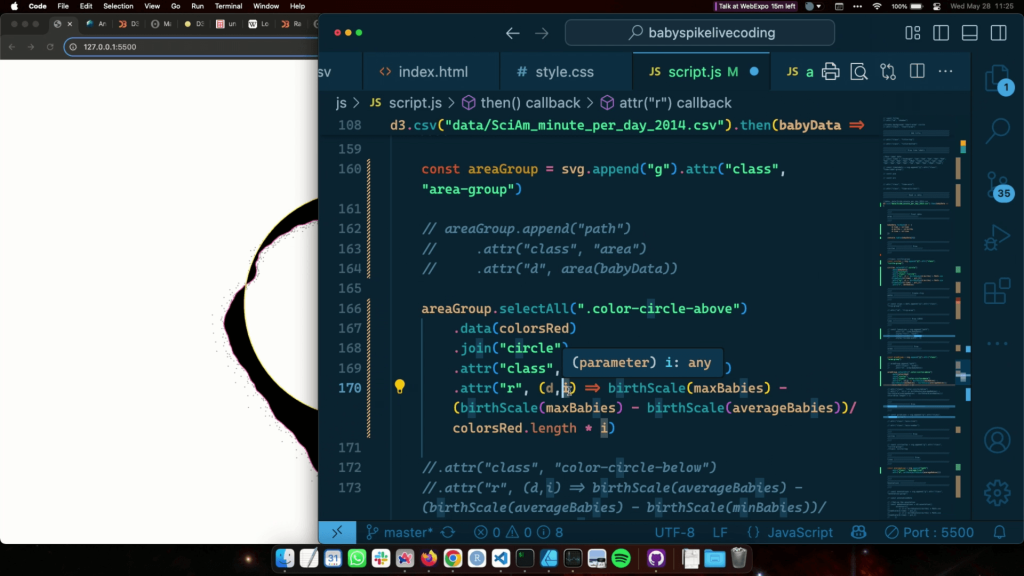 The dataset came from Zan Armstrong: the average number of babies born per minute in the United States. The structure was minimal and included a minute index from 0 to 1439, the number of births, and a pre-calculated regression line. Everything else was built live.