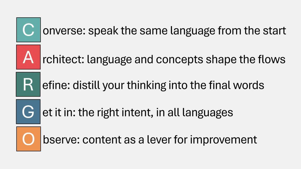 This leads to the crux of Erin’s argument: the value of a just-in-time approach. And here, Erin proposed the CARGO framework, consisting of several key moments when content designers should be woven into the development process. Instead of waiting until the final stages of product design, Erin advocated for ongoing collaboration. “You need to bring us in a lot earlier,” she urged, insisting that clarifying when to involve content design is essential for a successful product launch.